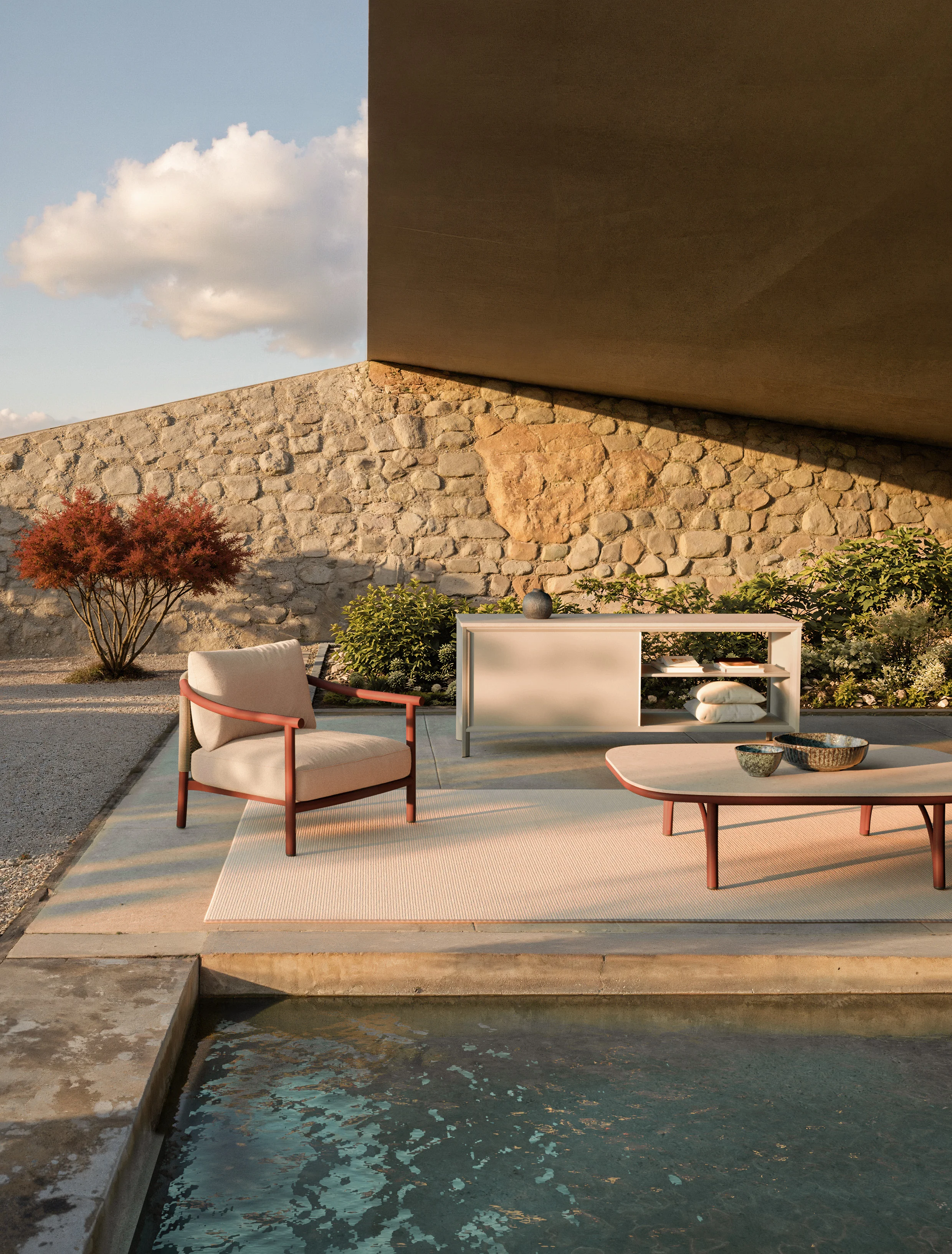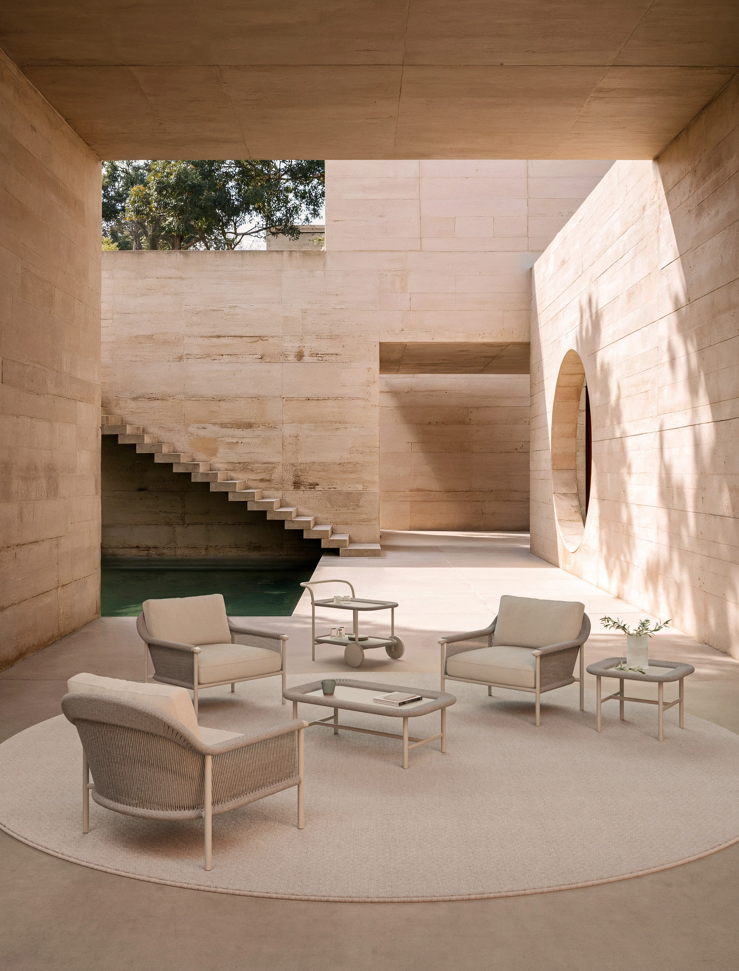 “Diseñé Arata como un trazo continuo de curvas suaves que une el comedor y la piscina, buscando el equilibrio entre la precisión del metal y la calidez del trenzado.”