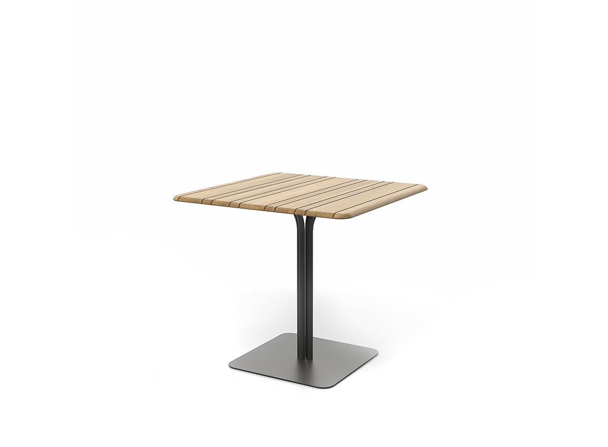 Combina una sólida estructura de aluminio con tapa en madera de teca, logrando un equilibrio perfecto entre resistencia, calidez y ligereza visual.