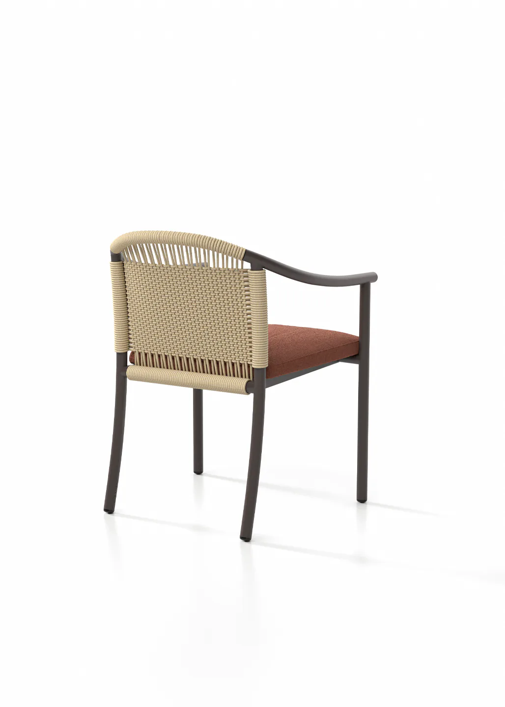 El sillón de comedor Arata aporta una elegancia táctil a la mesa. El cordón trenzado abraza la estructura de aluminio, ofreciendo una sentada cómoda y sofisticada para cenas al aire libre.