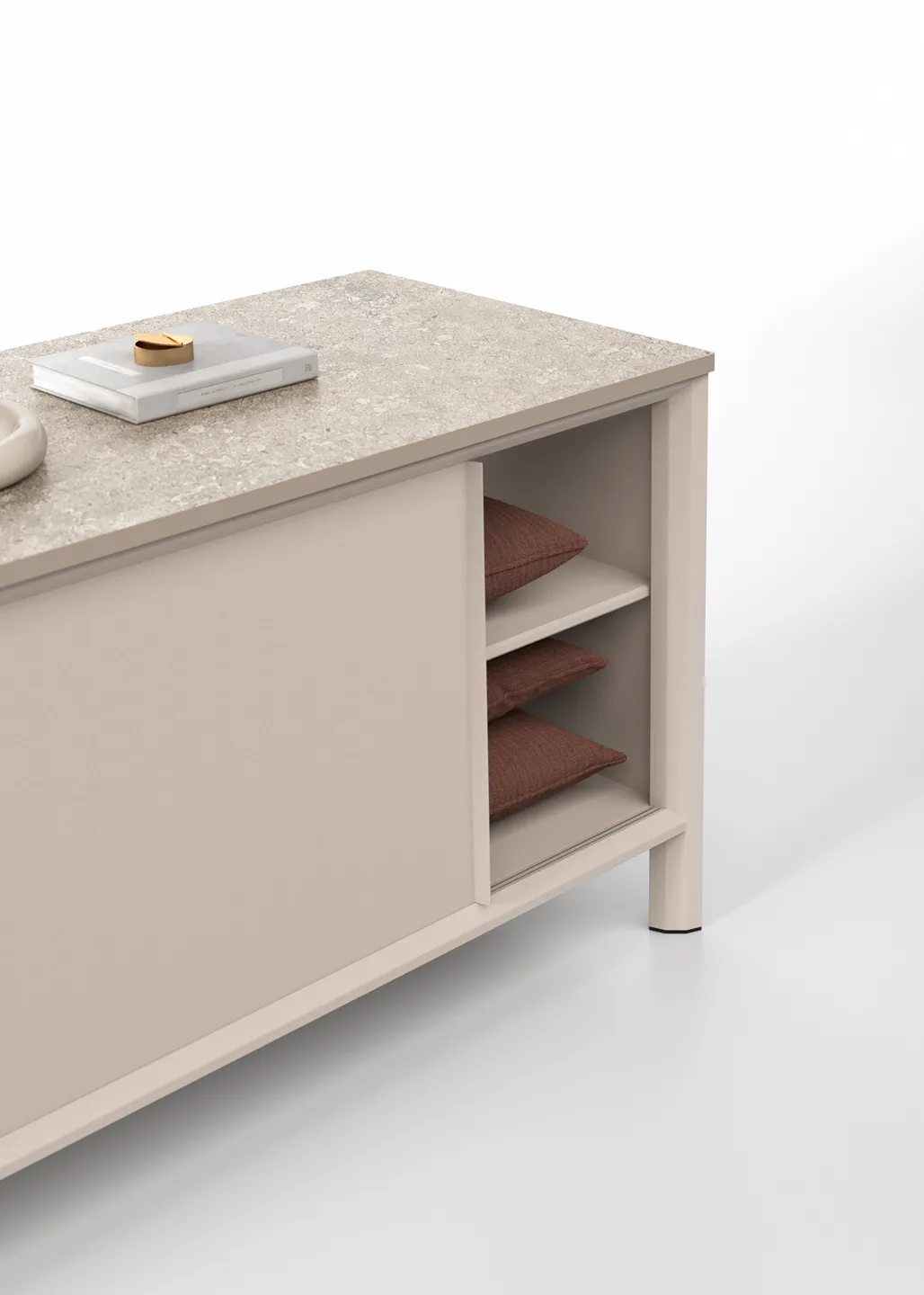 El aparador Aris es una solución de almacenamiento sofisticada que destaca por su marco de perfiles técnicos y su silueta minimalista. Una pieza versátil diseñada para organizar el espacio exterior con una elegancia discreta y formas geométricas precisas.
