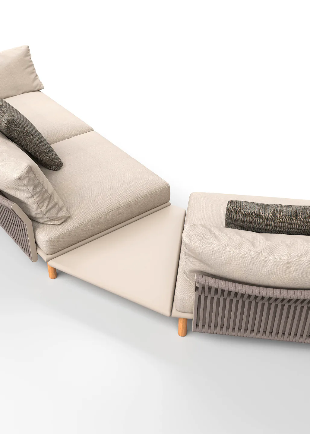 El módulo de 45º tempo es el elemento que permite romper la linealidad y crear formas orgánicas en el salón exterior. Versatilidad pura para adaptar la colección a cualquier arquitectura.