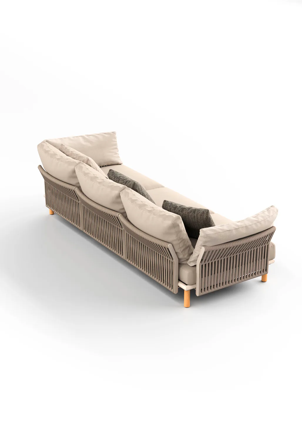 El sofá de tres plazas tempo destaca por su presencia equilibrada y su capacidad de envolver al usuario. La estructura de aluminio y el trenzado artesanal lo convierten en el epicentro de un lounge de lujo.