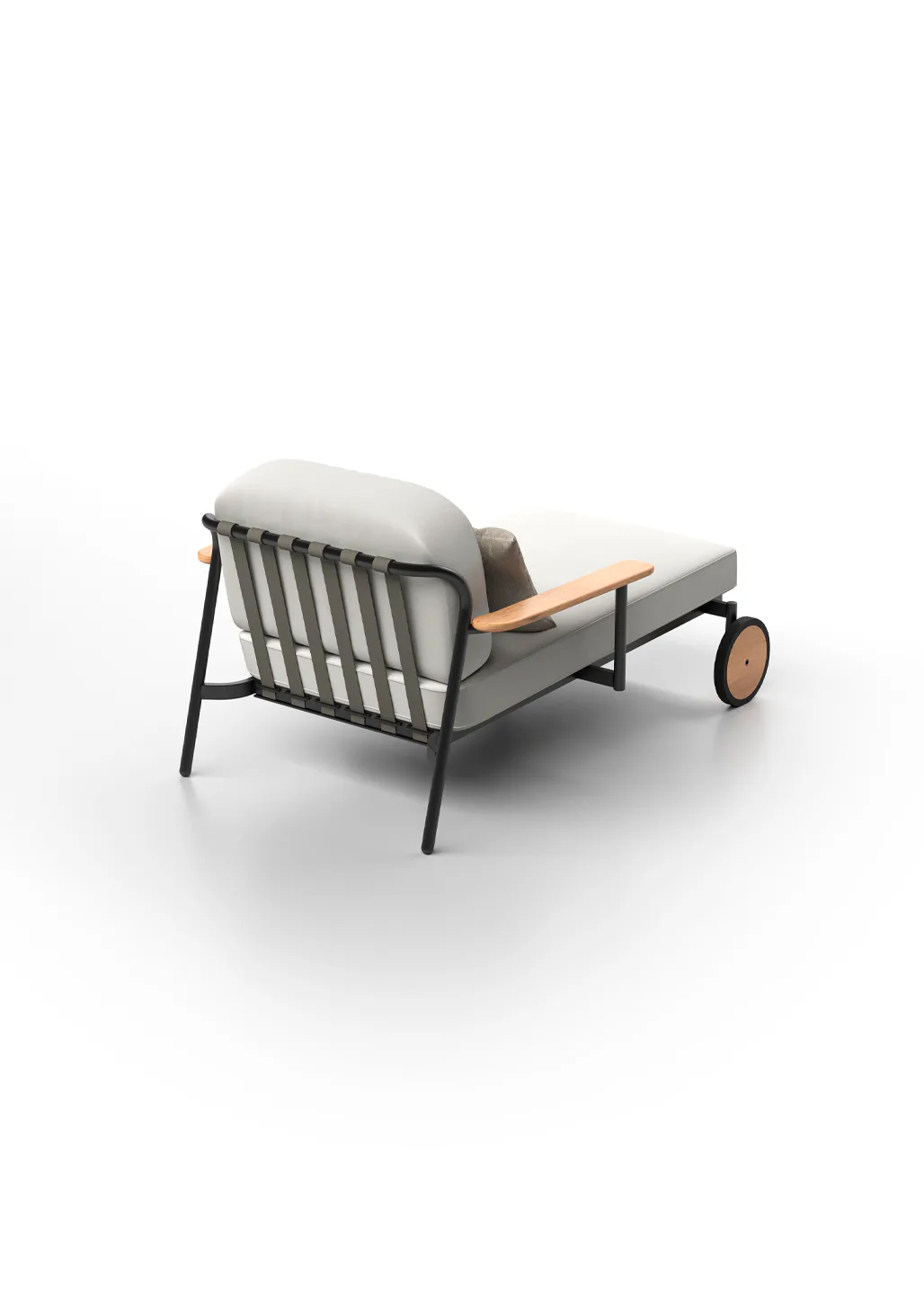 The Lacus lounger merges a fluid silhouette with exceptional durability. Its design invites deep rest, highlighting the contrast between the warmth of wood and the precision of metal.