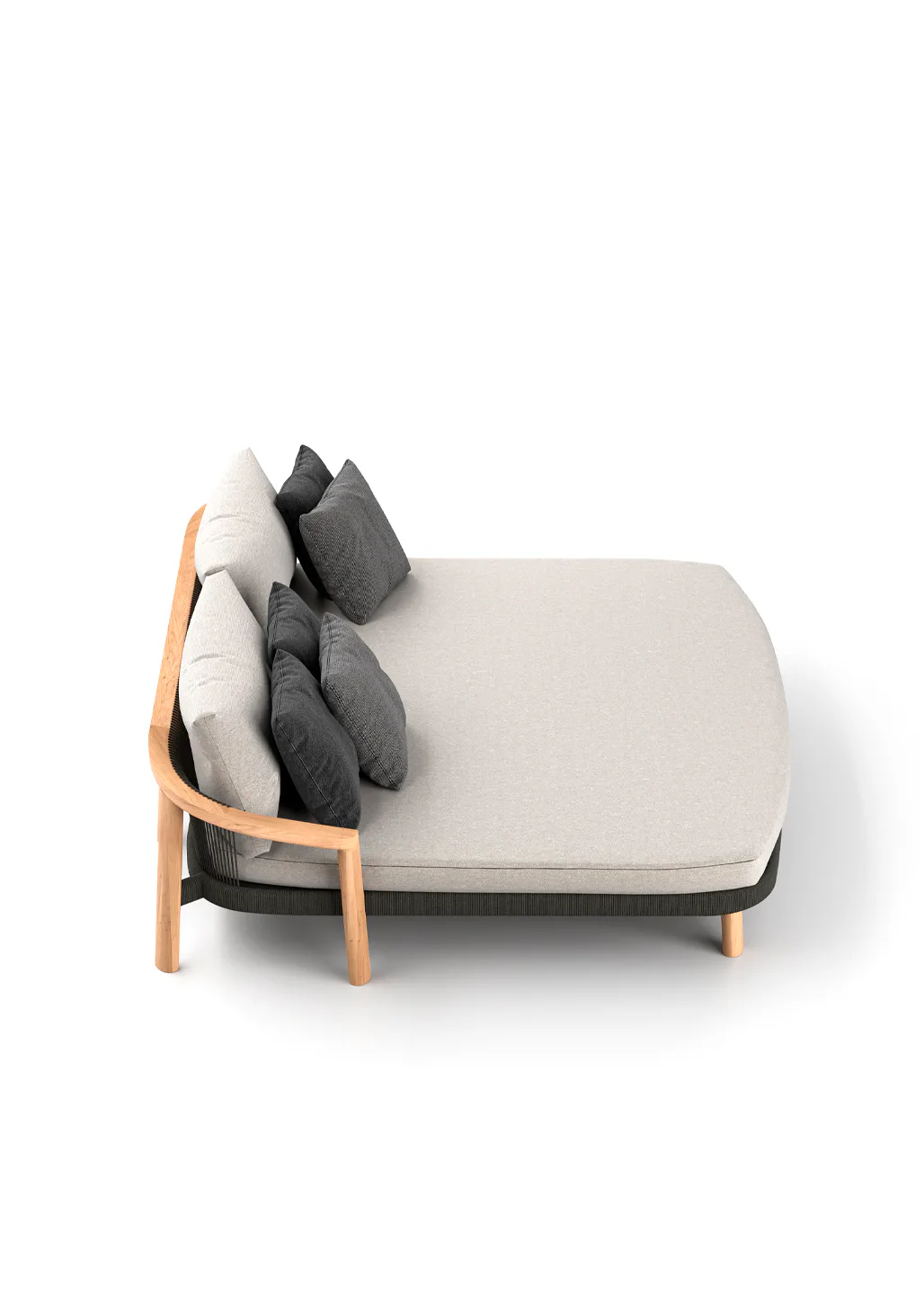 The Lenis daybed is an invitation to deep rest. Its organic design embraces the anatomy, cleverly using teak to trace a fluid structure with a captivating ethnic spirit.