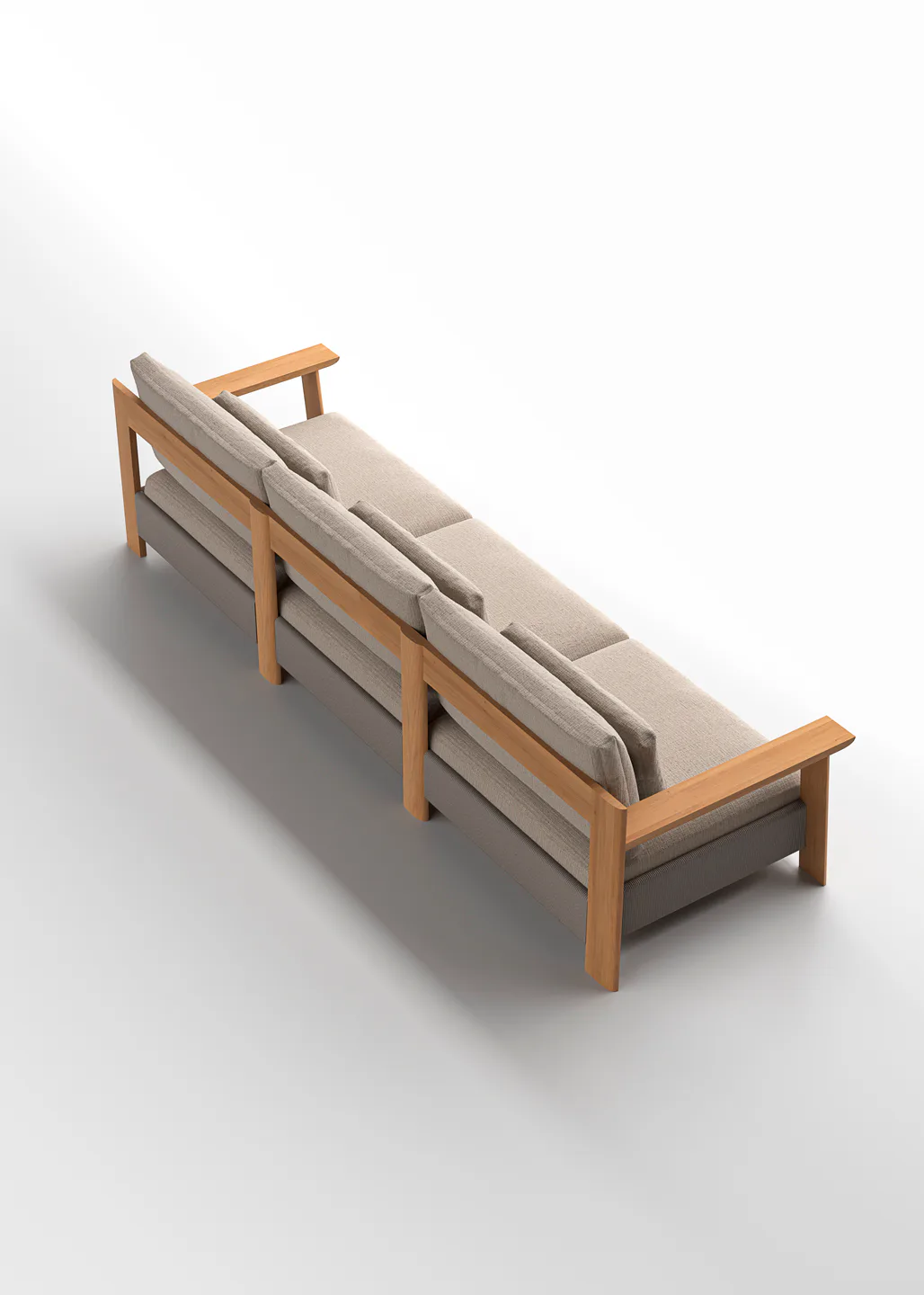 With an imposing yet visually light presence, the olma three-seater sofa defines the lounge space. The rhythmic repetition of the rope over the teak structure evokes an organic and timeless elegance.