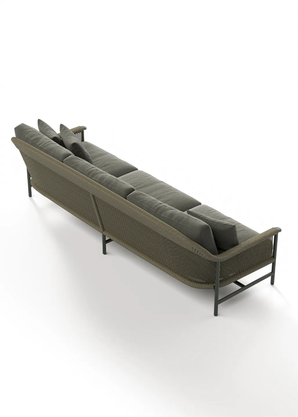 The Ronda three-seater sofa is the collection’s ultimate expression. Its structure follows a circular path that frames comfort, creating a large-format sanctuary of well-being.